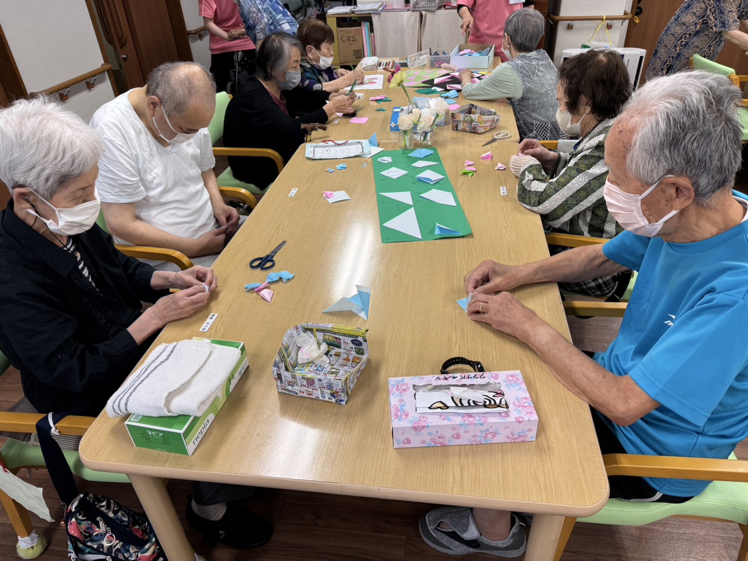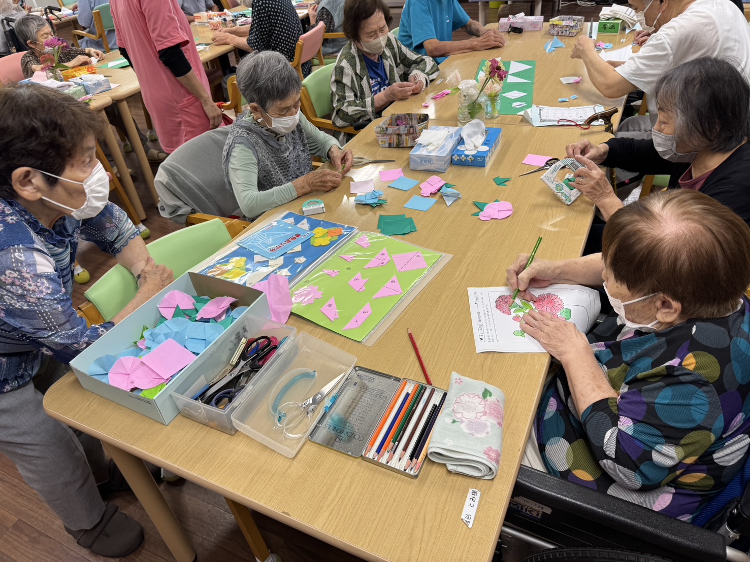 こんにちは! レクリエーションで『あさがお飾り作り』をしました😁🩵🩷